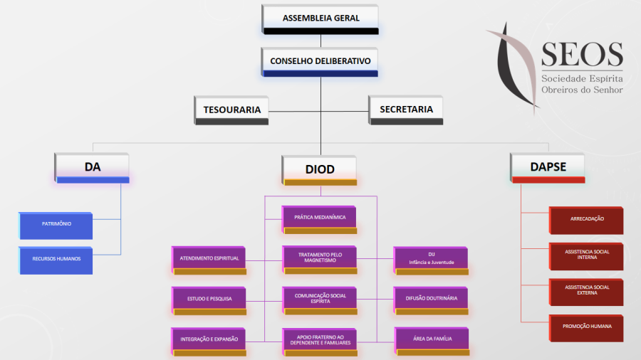 O organograma da SEOS, conforme se pode observar nas imagens abaixo, mostra como o Conselho Deliberativo, eleito pela Assembleia Geral dos associados há mais de um ano que mantenham atividade voluntária semanal e frequentem assiduamente ao menos um grupo de estudo na Casa há no mínimo um ano, define as normas e avalia os projetos e as ações da Diretoria Executiva, à qual cabe dar cumprimento e administrar as atividades de acordo com sua área de atuação.