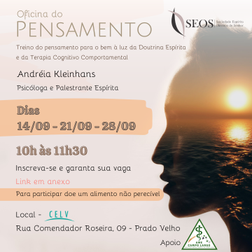Local: Centro Espírita Luz e Verdade - Rua Comendador Roseira, 09 - Prado Velho - Curitiba.