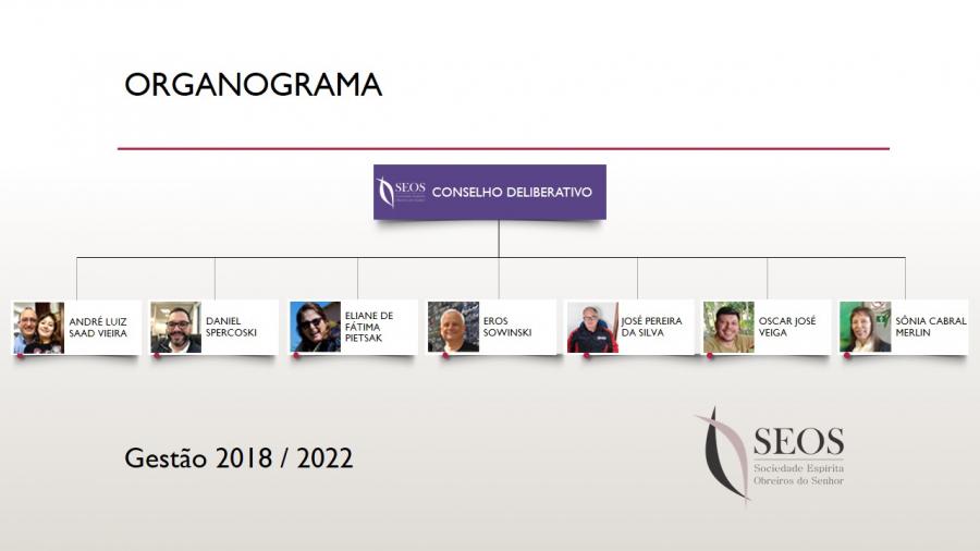 O organograma da SEOS, conforme se pode observar nas imagens abaixo, mostra como o Conselho Deliberativo, eleito pela Assembleia Geral dos associados há mais de um ano que mantenham atividade voluntária semanal e frequentem assiduamente ao menos um grupo de estudo na Casa há no mínimo um ano, define as normas e avalia os projetos e as ações da Diretoria Executiva, à qual cabe dar cumprimento e administrar as atividades de acordo com sua área de atuação.